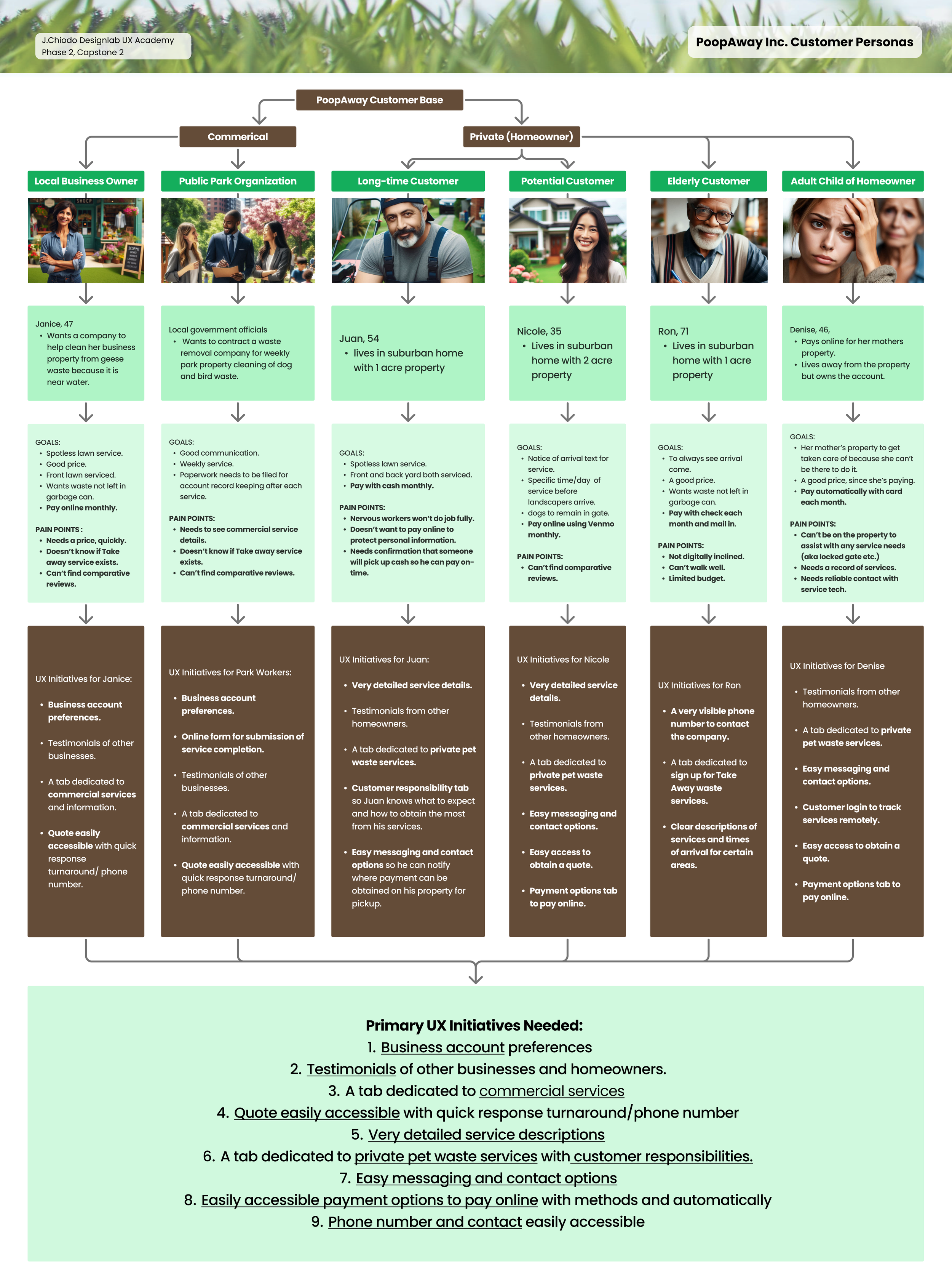 Even as a smaller company working primarily with residential clients, each had the potential to develop into a long-term, trust-based relationship. PoopAway’s drivers were attending to private properties, and each client, including commercial ones, had unique needs that, if met, would ensure their commitment to the service. It was crucial to explore a variety of personas and design inclusively to address these needs.